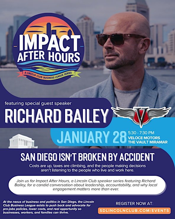 Join us for Impact After Hours, a Lincoln Club speaker series featuring Richard Bailey, for a candid conversation about leadership, accountability, and why local engagement matters more than ever. Please contact Dena Cruden, at Dena@SDLincolnClub.com.