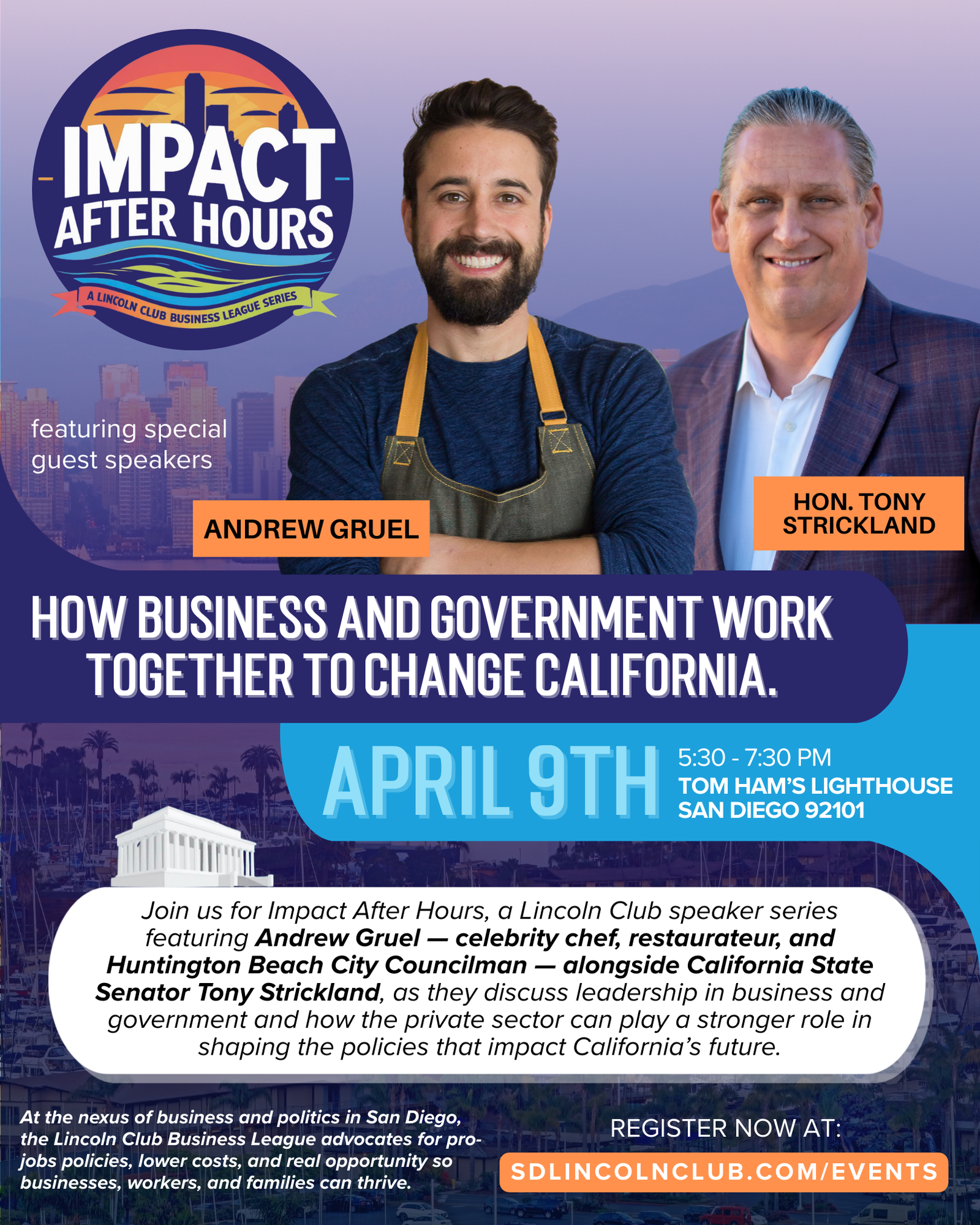 Join us for Impact After Hours featuring celebrity chef and Huntington Beach City Councilman Andrew Gruel alongside California State Senator Tony Strickland for a joint keynote discussion on leadership, policy, and the future of California.
