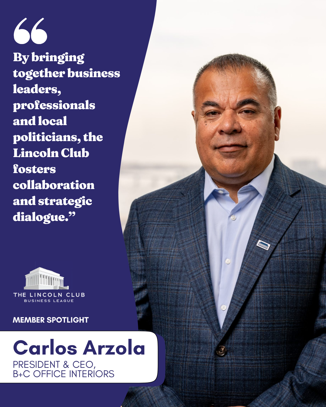 REFLECTIONS ON THE LINCOLN CLUB: “The Lincoln Club is the leading organization dedicated to promoting the growth and prosperity of the business community. By bringing together business leaders, professionals and local politicians, the organization fosters collaboration and strategic dialogue. The Lincoln Club supports policies and ideas that encourage economic development, entrepreneurship and a strong business climate. I encourage every business leader to join the Lincoln Club, as together we help strengthen and support the business community.” – Carlos Arzola