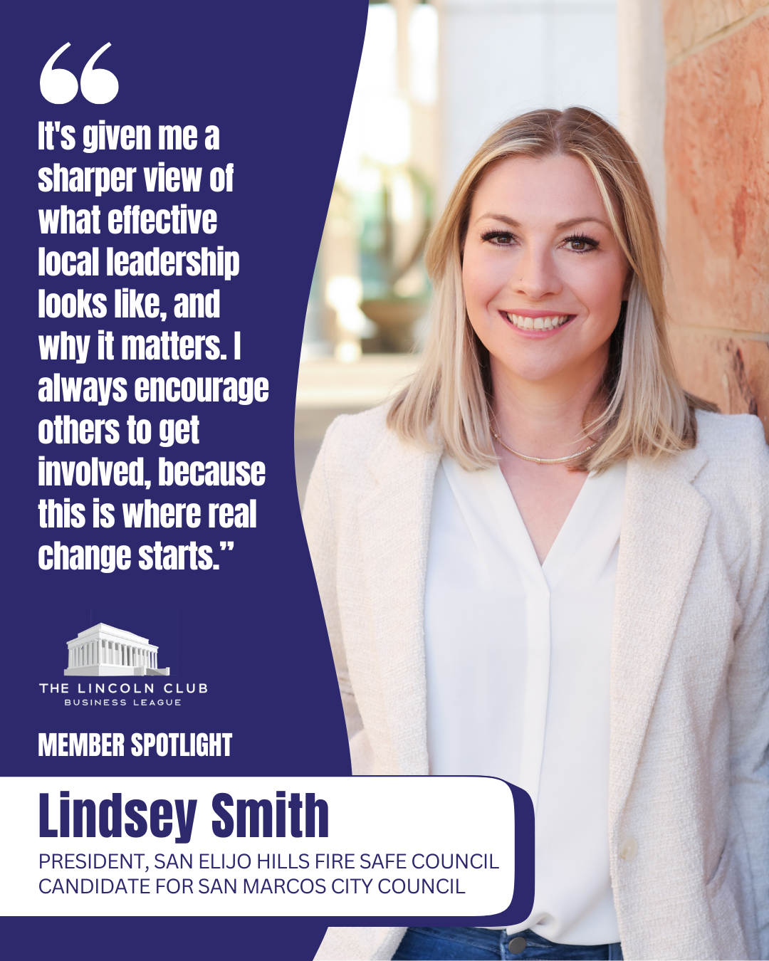 REFLECTIONS ON THE LINCOLN CLUB: “I joined the Lincoln Club because I believe in strong, pro-business leadership and the impact local policy has on building safe, successful communities. As a nonprofit leader, mom of three, and candidate for San Marcos City Council, I’ve seen how important it is for local government to support, not get in the way of, small businesses and working families. Being a member connects me with people who care about public safety, economic freedom, and keeping government accountable. It’s given me a sharper view of what effective local leadership looks like, and why it matters. I always encourage others to get involved, because this is where real change starts.” – Lindsey Smith